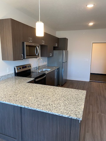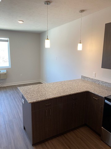 This Studio apartment has an open layout and several amenities including stainless steel appliances, large cabinets, and granite countertops. There is LVT flooring throughout the living room and kitchen, fabulous overhead lighting, a ceiling fan, and a funky barn door leading to the bathroom and closet. This is available on the 3rd floor at EOS 75.