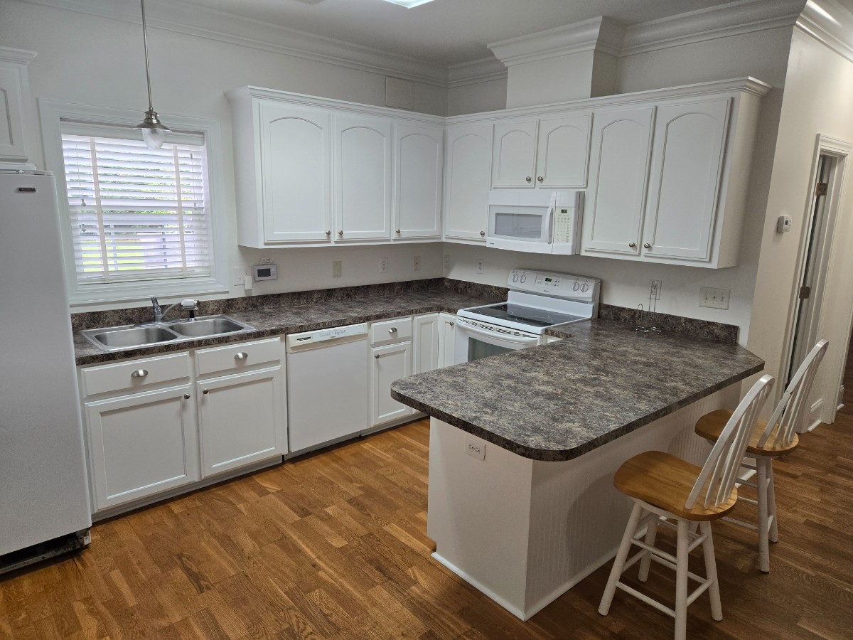 One bedroom with 2 closets, full bathroom, open living, dining, kitchen area with bar. Single car garage, 2 side doors with landscaped sidewalk, large deck area with private backyard. Quiet neighborhood in mid town morehead city located between the community College and Hampton Inn.