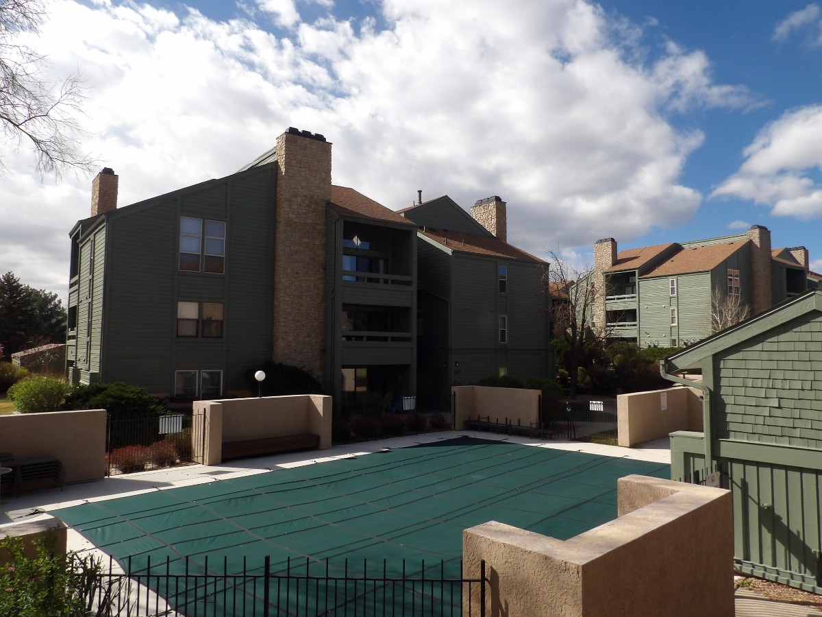 This well-kept two-bedroom, one-bath condo offers easy living with beautiful views of Pikes Peak. The tiled entry opens into a bright kitchen and a comfortable, carpeted living room. The kitchen includes all appliances, tile flooring, and a convenient pantry. The living room features a real wood-burning fireplace and walks out to a covered IOx5 deck overlooking the pool area. The spacious primary bedroom also opens to the patio and includes a private vanity area with direct access to the main bath. The secondary bedroom offers a generous walk-in closet. The unit comes with an extralarge storage room located just outside the front door. The community offers a large pool, hot tub, and picnic area, all set within beautifully maintained grounds — perfect for relaxing and enjoying Colorado living.