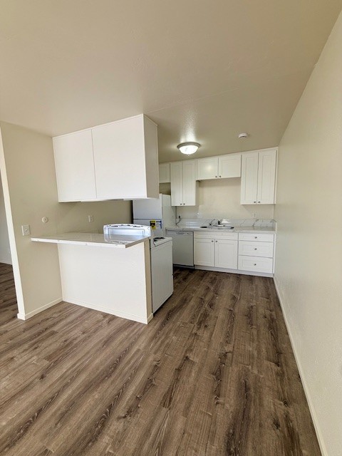 Spacious 2-bedroom, 2-bath apartment featuring a large living room and separate dining area. The home includes a fully remodeled kitchen with white cabinets, quartz countertops, and modern appliances including a refrigerator, stove, and dishwasher. The entire unit has been freshly repainted and features brand-new flooring throughout, giving the home a clean and modern feel.