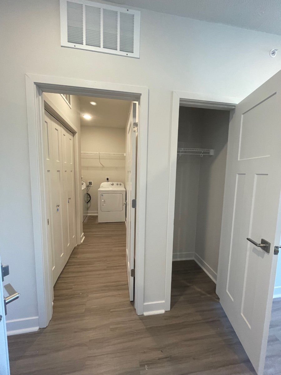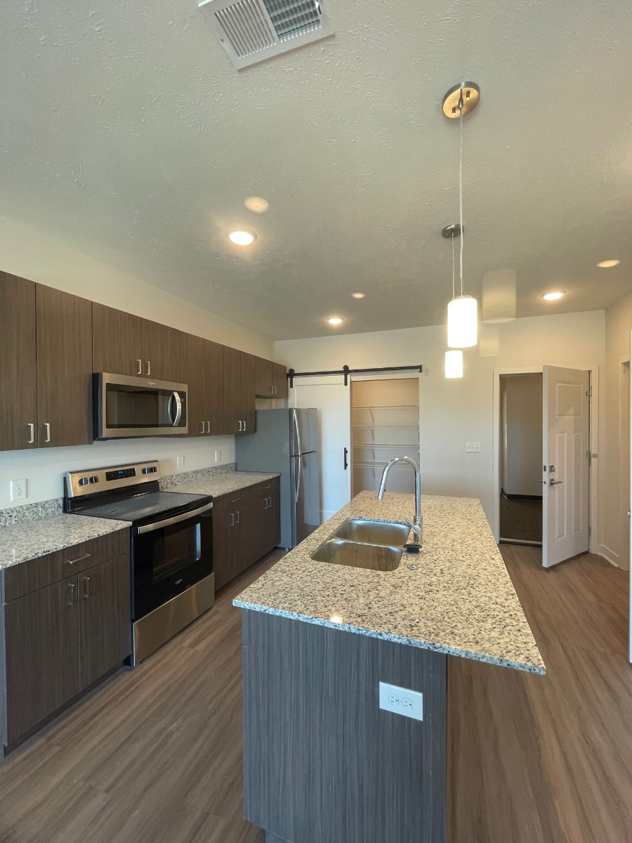 This 3 bedroom apartment has an open layout and several amenities including stainless steel appliances, large cabinets, and granite countertops. There is LVT flooring throughout the living room and kitchen, fabulous overhead lighting, a ceiling fan, and a funky barn door leading to a walk in pantry off the kitchen. This is available on the 2nd floor at EOS 75.