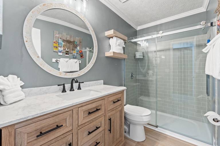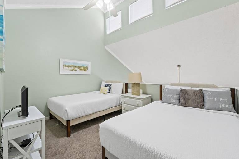 Completely renovated condo with vaulted ceilings, gorgeous quartz countertops, porcelain subway tile backsplash with new LVP floors on first level. New vanities, mirrors, lighting and crown molding. Three TV's with a 75 inch TV in the living room. The outdoor area has just been renovated with pickle ball courts, pool, clubhouse, putting green, fire pits with covered picnic tables and grills. This condo is footsteps to the beach with free parking right in front of the unit. Utilities included in the rent: water, sewer, trash and basic cable! Enjoy the front balcony with views of the water and the sand. The condo has an outdoor shower beside the stairs. It is only 2 miles away from Pier Park but is in a quiet, family-friendly area.