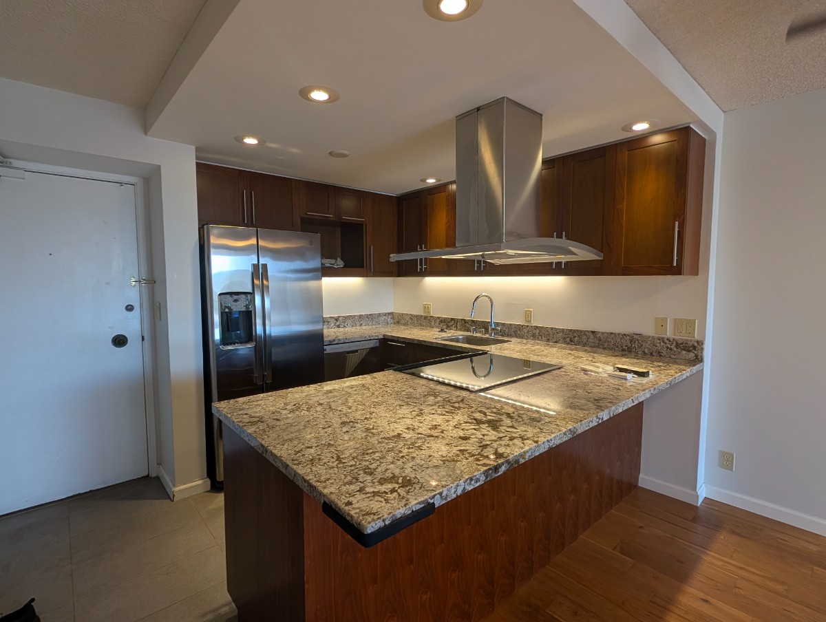 This fully renovated 2-bedroom, 2-bathroom unit offers a sophisticated, move-in-ready living space featuring high-end finishes throughout. The modern kitchen is equipped with elegant granite countertops and stainless steel appliances, with wood flooring throughout. For added convenience, the unit includes an in-unit washer and dryer.