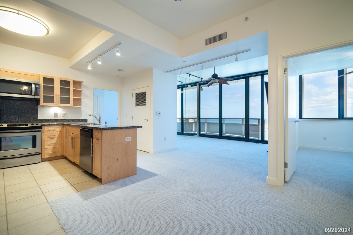 DESCRIPTION: Spacious 2BR/2BA/2PKG in Keola Lai. Only 4 units on your floor below the PH! Relax & unwind…take in the spectacular panoramic ocean, coastline, Honolulu Harbor, city, and sunset views from this super high-floor residence. Graced with the largest 116 sq. ft. lanai in the building (excluding the PH units) …a rarity for new condos in Town! Extra high 9 feet 6-inch ceiling height with floor-to-ceiling glass adds to the sense of space and light. Separate sit-down dining area for 4+. Immaculate 'move-in' condition! Newly installed carpet, stainless steel appliances, central AC and much more! Extremely 'well-managed' and cared for the condominium building. A great and unique value in Town, especially for those looking for true indoor-outdoor living! Water/Sewer, Cable & Internet are Included in the rent. TV stays in the Living room.