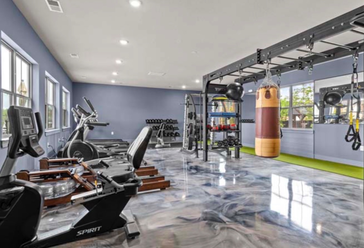 Community amenities include a resort-style pool, fitness center, clubhouse, walking trails, pickleball court, dog park, and green space. The clubhouse (“The Station”) also includes co-working areas, lounge spaces, and a coffee bar.