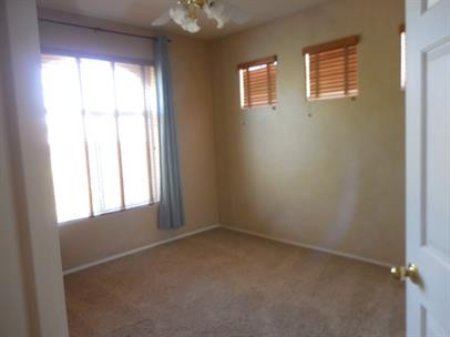 Bedroom 3 10 x 11 with ceiling fan, mirror closet door and pot shelves.