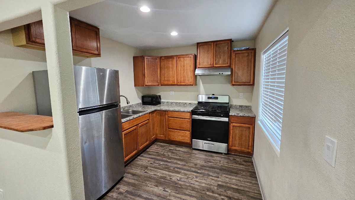 Gourmet Kitchen: Featuring sleek stainless-steel appliances (including a full-sized refrigerator and gas range), elegant granite countertops, and warm wood cabinetry. The open pass-through window to the living area makes entertaining a breeze.