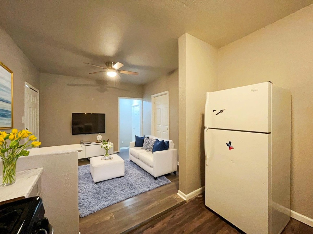 The kitchen is fully equipped with a gas stove, microwave, and refrigerator ideal for everyday meals or weekend cooking. The shared bathroom features a walk-in shower and single vanity, offering a clean, modern touch.