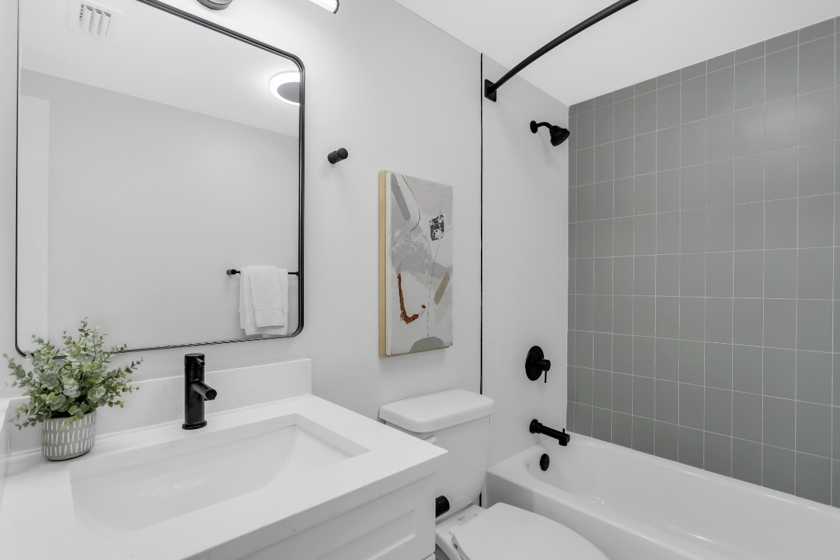 The bedroom offers ample closet space and soft natural light, while the bathroom steals the show with statement geometric floor tile, black matte fixtures, and a curved shower rod for added comfort and style.