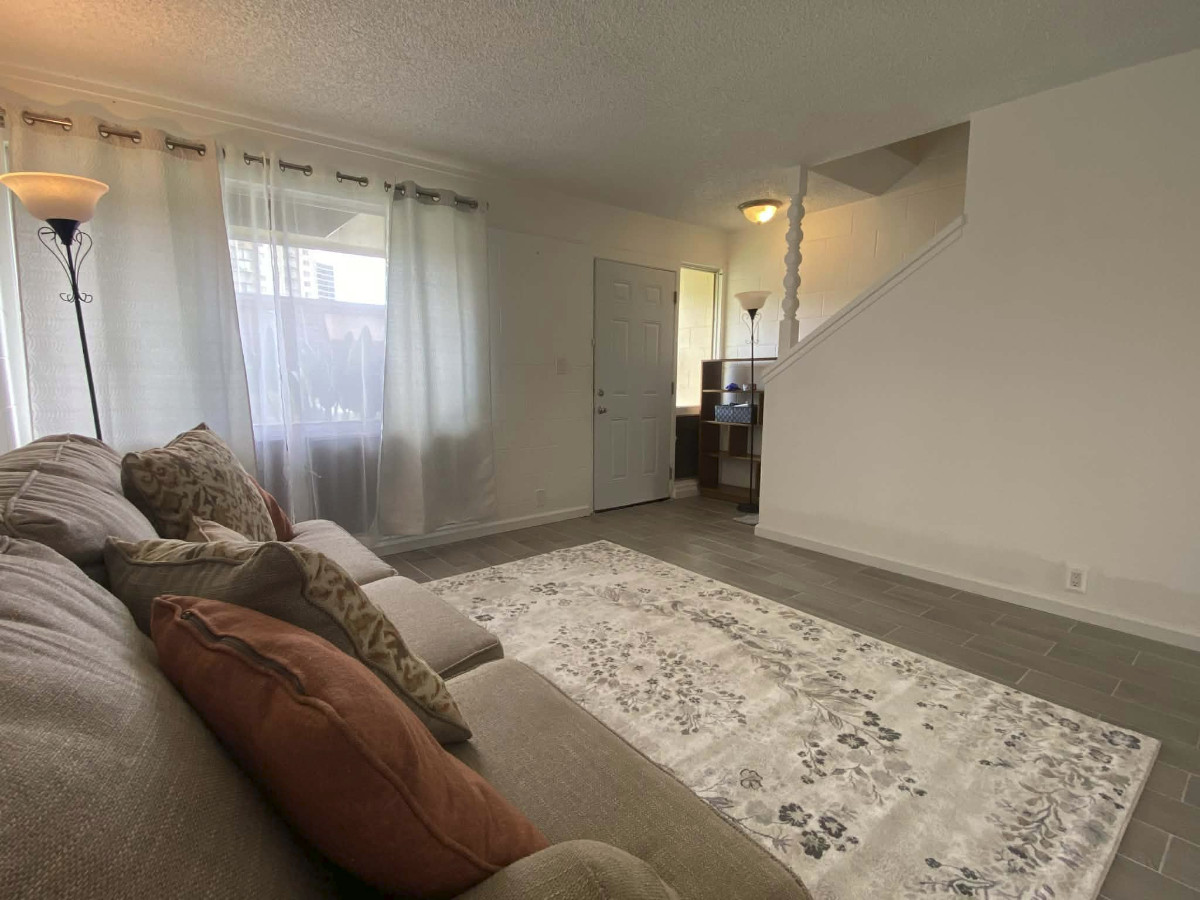 Move in ready 2BD + 1.5BA townhouse with newly renovated ground level floors and kitchen backsplash. This unit features a full size kitchen/appliances, in unit washer-dryer, and new AC units in bedrooms and living room. In walking distance to Pearlridge mall and park. Bus and Skyline station access nearby. Unit comes partially furnished. Unit is in a safe and quiet community with access to large pool/kiddie pool and clubhouse. Gated play area for children available. One assigned parking spot included. Can apply for additional parking space with property management after occupancy. Street parking available nearby. Water, refuse and internet included. Tenant responsible for electric and cable (if desired). Seeking long-term/minimum 1 year, clean and quiet tenant(s) or small family. Small to medium sized animals after approval and deposit. Rent and security deposit due prior to occupancy.