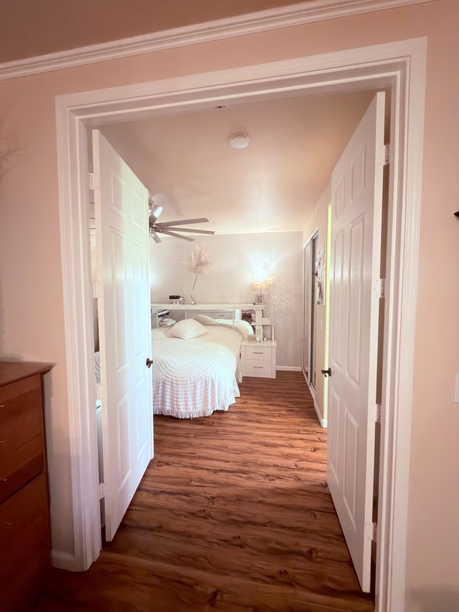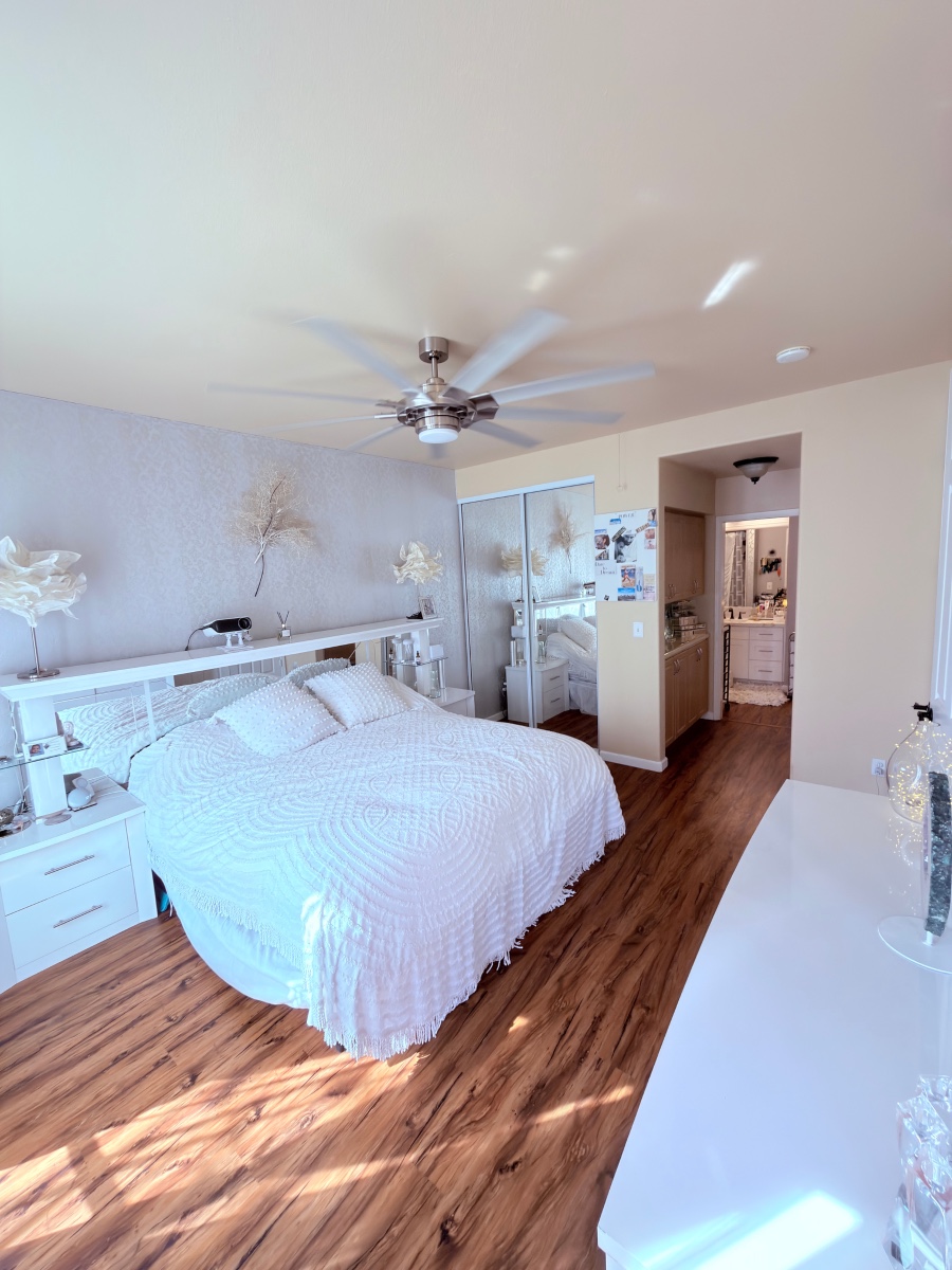 The master bedroom features elegant French doors, creating a beautiful open and airy environment. As a corner/end unit, the home enjoys added privacy, extra windows, and a more expansive feel.