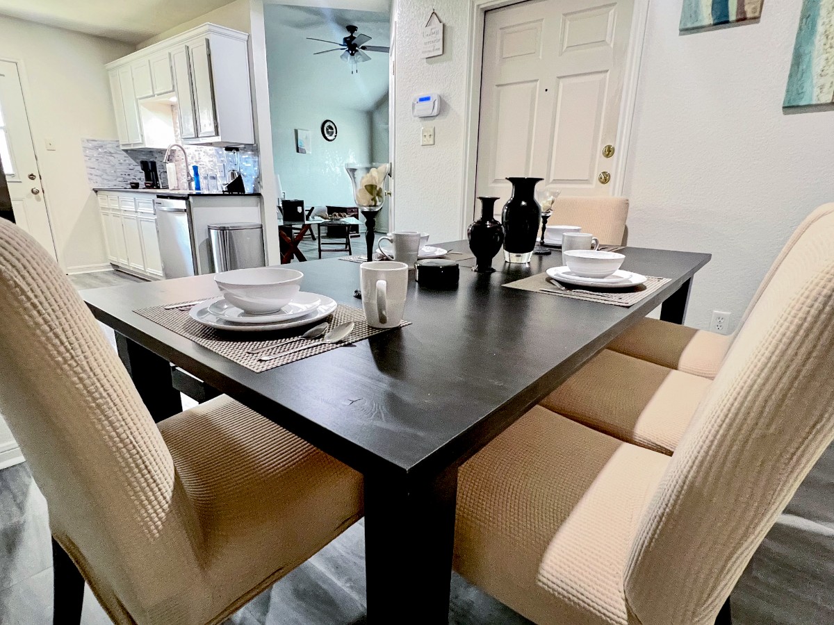 Enjoy a fully equipped kitchen with modern appliances including an air fryer, coffee maker, and with high-speed WiFi and smart TVs throughout the home. A dedicated workspace with CAC reader and printer makes this property ideal for remote work or military administrative needs.