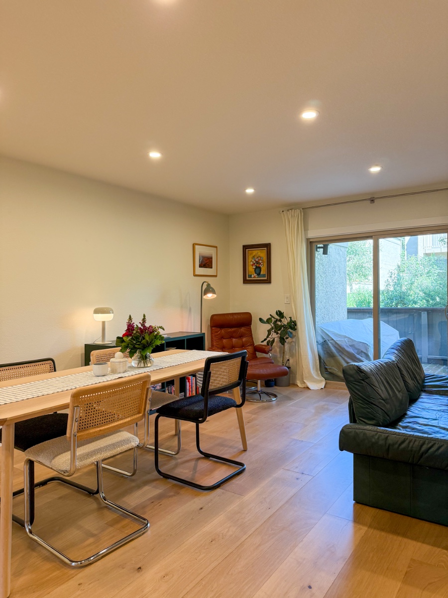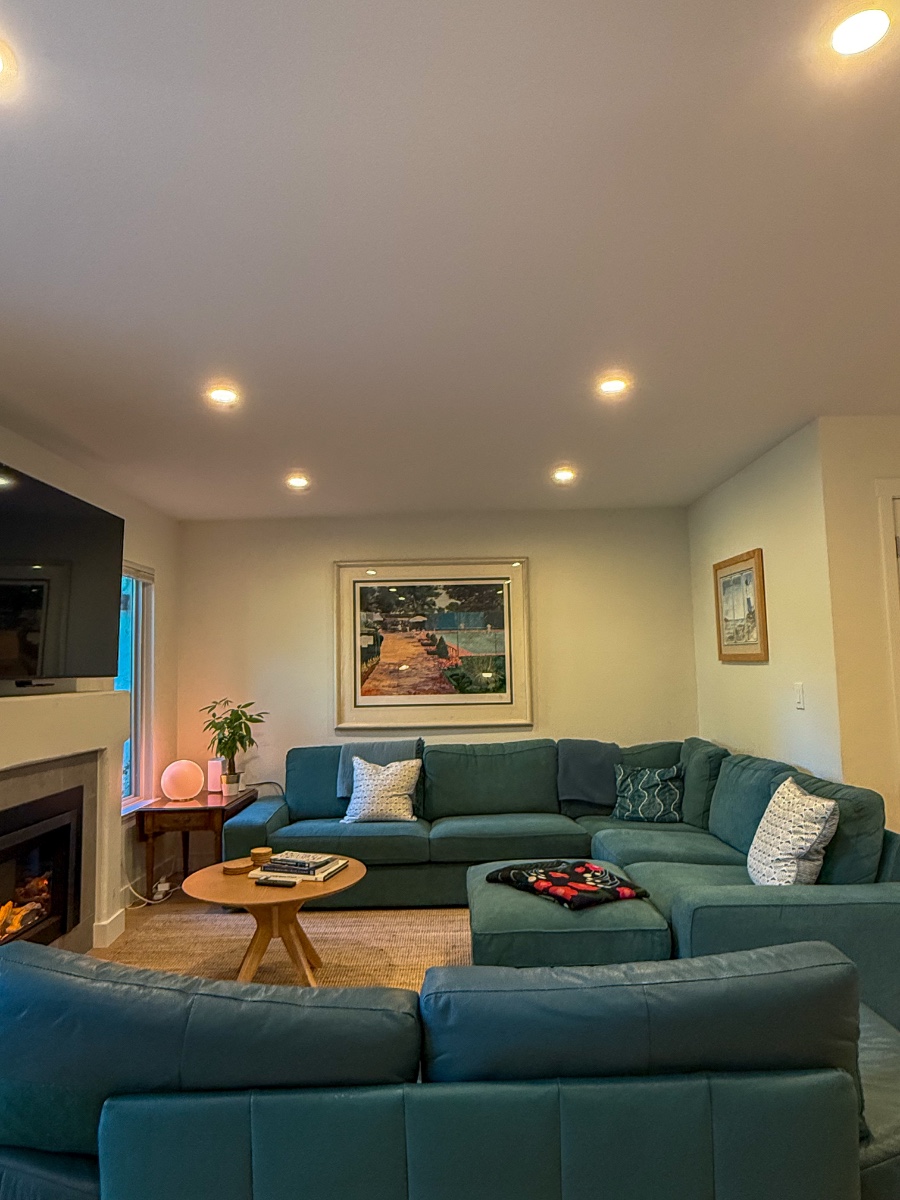 The bright living area includes a sleek electric fireplace and 65" smart TV, flowing into a spacious dining area perfect for hosting.