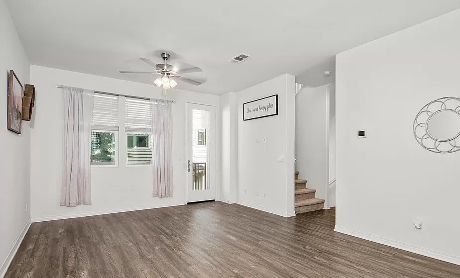 Open floorplan with hardwood flooring, spacious living and bedroom areas. Builder upgrades include granite counters, elegant cabinetry, stainless appliances, interior laundry closet, AC, dual vanity sinks in the primary bathroom, and tankless water heater. Peak water views from both 2nd and 3rd floor. Upstairs bedrooms have ensuite bathrooms and walk in closets. Large two car garage with extra storage.