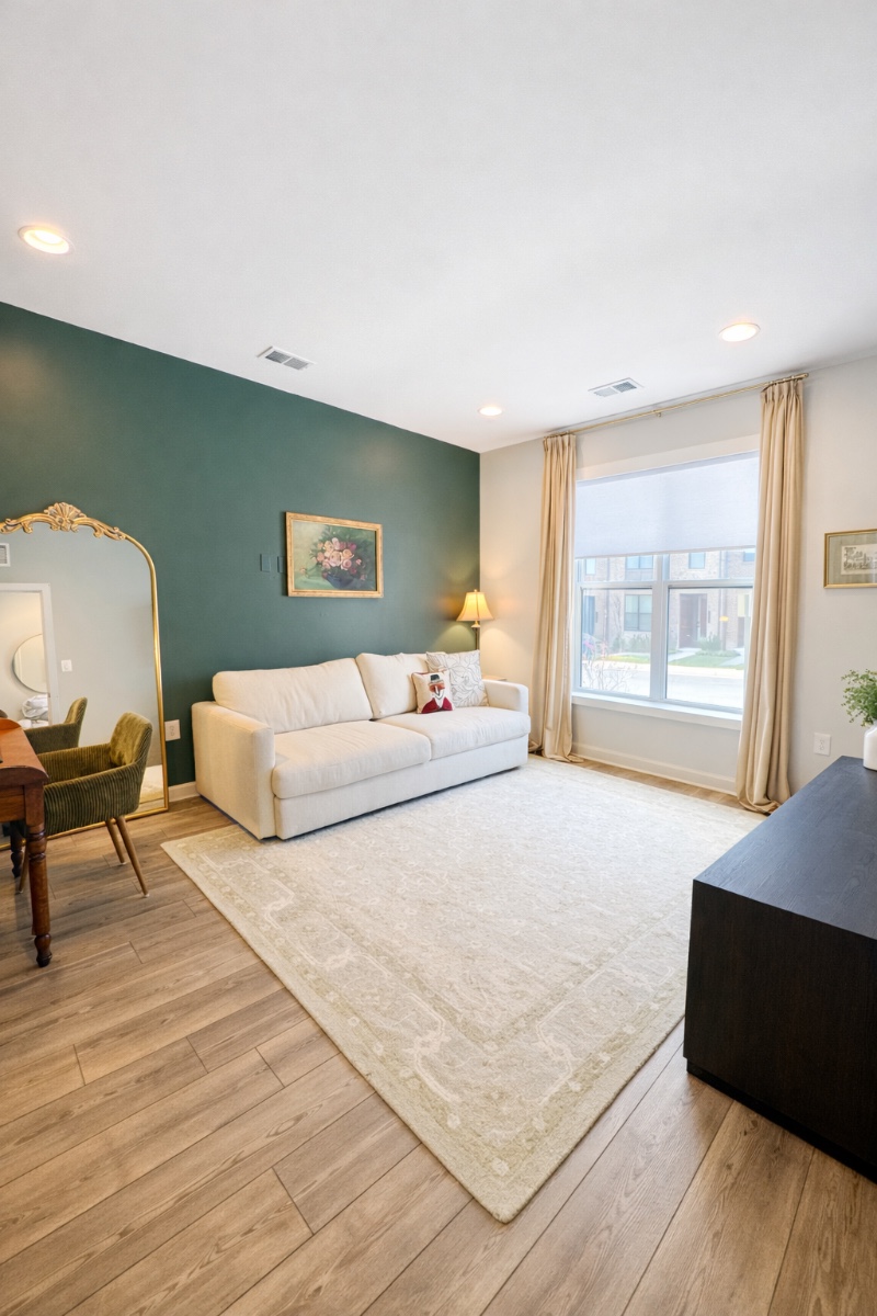 The finished lower level features a bedroom and full bath, ideal for guests, a home office, or extra living space. Clever built-out storage under the staircase, accessed through the hall closet, offers a surprising amount of hidden space for seasonal gear and holiday decorations. The open-concept main level has 9-foot ceilings, a spacious dining area, and an upgraded end-unit kitchen with a huge island, tons of storage, and light that makes cooking feel like a joy.