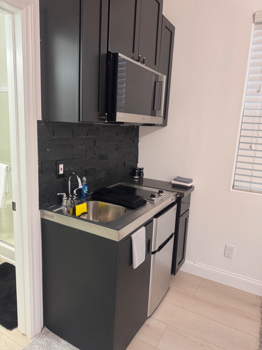 • Compact kitchenette with mini fridge (for light cooking)