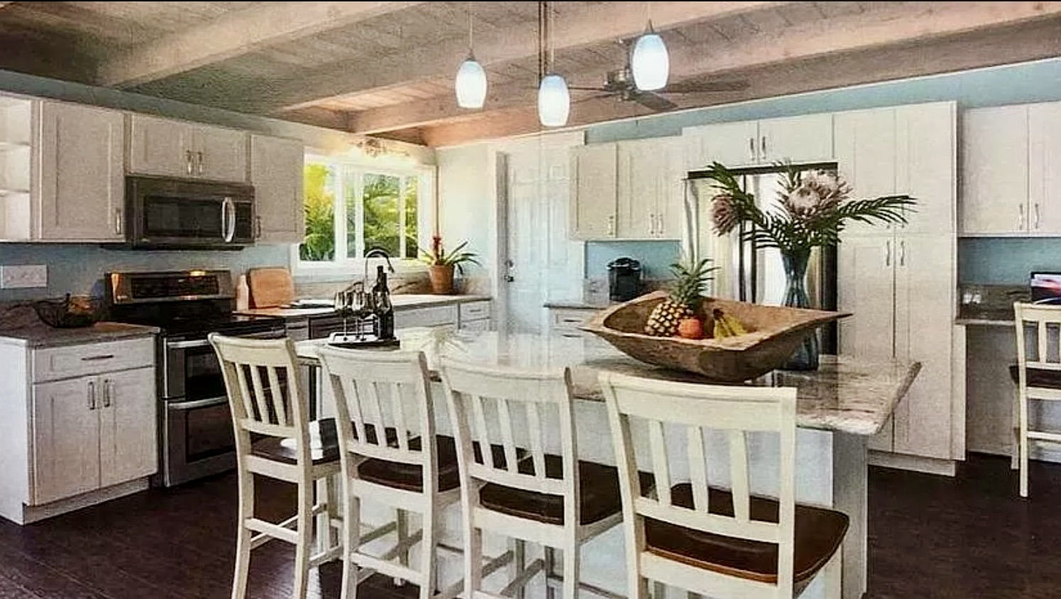 This open design gourmet kitchen and living space comes complete with granite counters, double oven stove, refrigerator with ice maker and water dispenser, microwave and dishwasher. A built-in workspace brings additional functionality to the kitchen. You will enjoy new paint inside and out, and multiple ceiling fans keep the trade winds moving. Bedrooms boast extra large closets and the bathroom is bright with an updated walk in shower. A large hall closet offers additional storage space. Lots of windows and sliding glass doors surround you with a bright indoor/outdoor living experience. The open lanai and large yard offer safety, privacy and is perfect for gardening, grilling and swimming! The pool is newly remodeled and BEAUTIFUL!. The back yard is furnished with an outdoor dining set and lanai furniture. You also have a RARE, fully enclosed, two car garage offering ample storage space with lots of shelving, and a laundry center with utility sink.