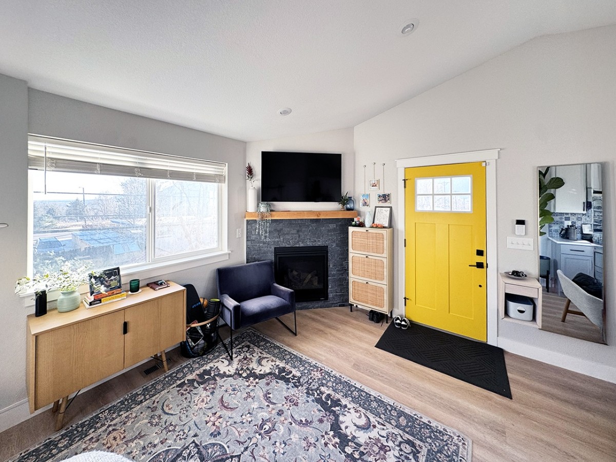 The home features an open-concept living room with a cozy gas fireplace and an eat-in kitchen equipped with newer appliances, including a stove, refrigerator, dishwasher, and microwave.