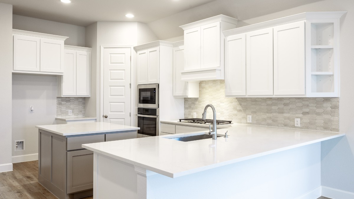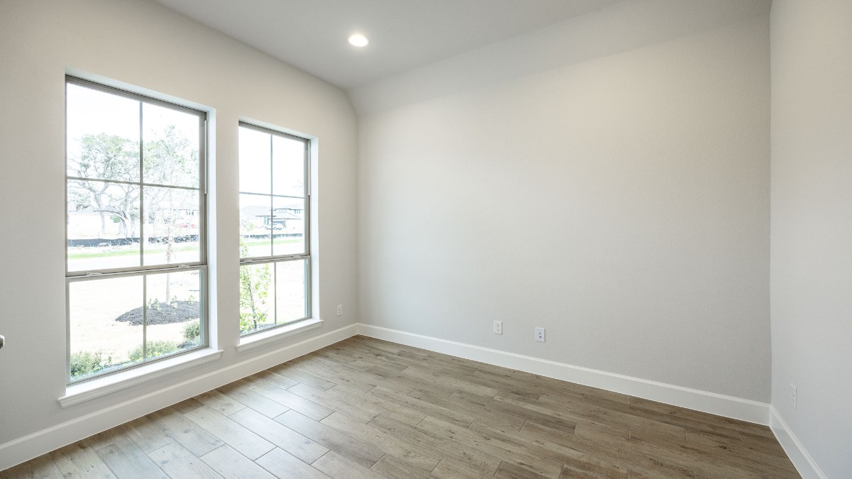 Home office with French doors set at entry with 11-foot ceiling. Open kitchen offers center island, a 5-burner gas cooktop and corner walk-in pantry. Dining area opens to spacious family room with wall of windows. Private primary suite includes bedroom with wall of windows. Dual vanity, freestanding tub, separate glass-enclosed shower and large walk-in closet in primary bath. Abundant closet space and natural light throughout. Covered backyard patio. Mud room off two-car garage.