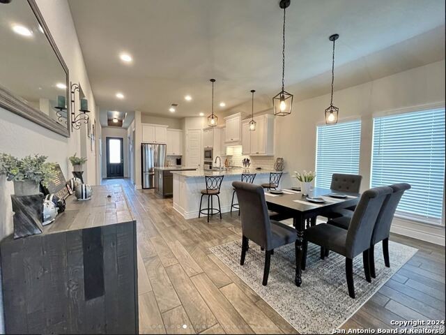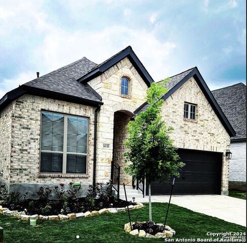Discover your dream home in Kallison Ranch! This stunning one-story home features an open floor plan with high ceilings, recessed lighting, and abundant natural light. The kitchen impresses with custom white cabinetry, a large island with a breakfast bar, sleek white tile backsplash, gas cooking, stainless steel appliances (including a refrigerator), and a spacious pantry. The living and dining areas include ceramic tile flooring, a ceiling fan, and a mounted 75" Samsung LED TV. The oversized master suite offers a tranquil retreat with a garden tub, walk-in shower, double vanity, and a large walk-in closet. A dedicated study is perfect for a home office. The utility room is equipped with a washer, dryer, and built-in storage bench. Step outside to a spacious backyard backing to a greenbelt, complete with a covered patio, retractable blinds, built-in lighting, and a sprinkler system. Conveniently located near shopping, dining, entertainment, and major highways-this home has it all!