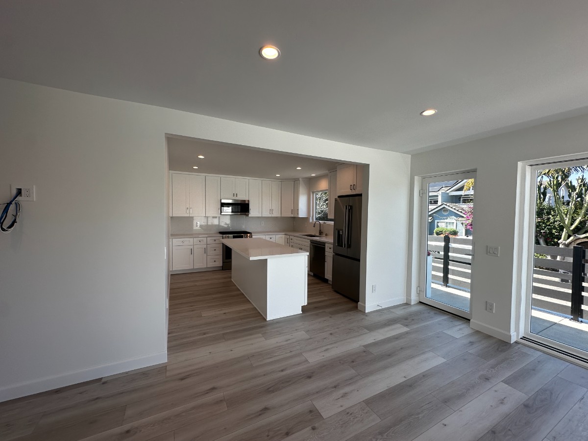 This stunning 3 bed / 2 bath home offers a light and bright open-concept layout with wide-plank laminate flooring, recessed lighting, and expansive multi-slide glass doors that create a seamless indoor/outdoor living experience, perfect for entertaining or relaxing after a day at the beach. The designer kitchen features custom cabinetry, quartz countertops, stainless steel appliances, and a spacious center island that flows effortlessly into the living area. Both bathrooms have been beautifully upgraded with custom finishes, while modern comforts include A/C, solar for energy efficiency, and a tankless water heater. A full-size stackable washer and dryer are also included for added convenience. Enjoy a clean, low-maintenance outdoor space along with a private storage unit in the back, ideal for surfboards, bikes, and all your beach gear. Located just minutes from the sand, dining, and local favorites, this home offers the perfect blend of style, comfort, and unbeatable location.