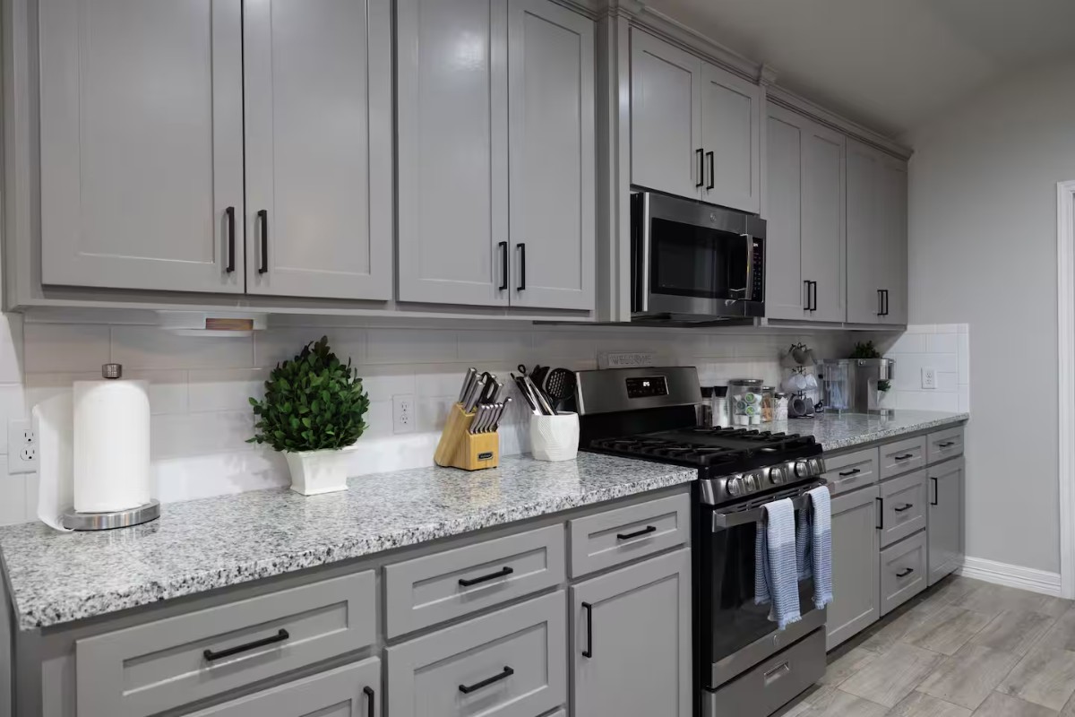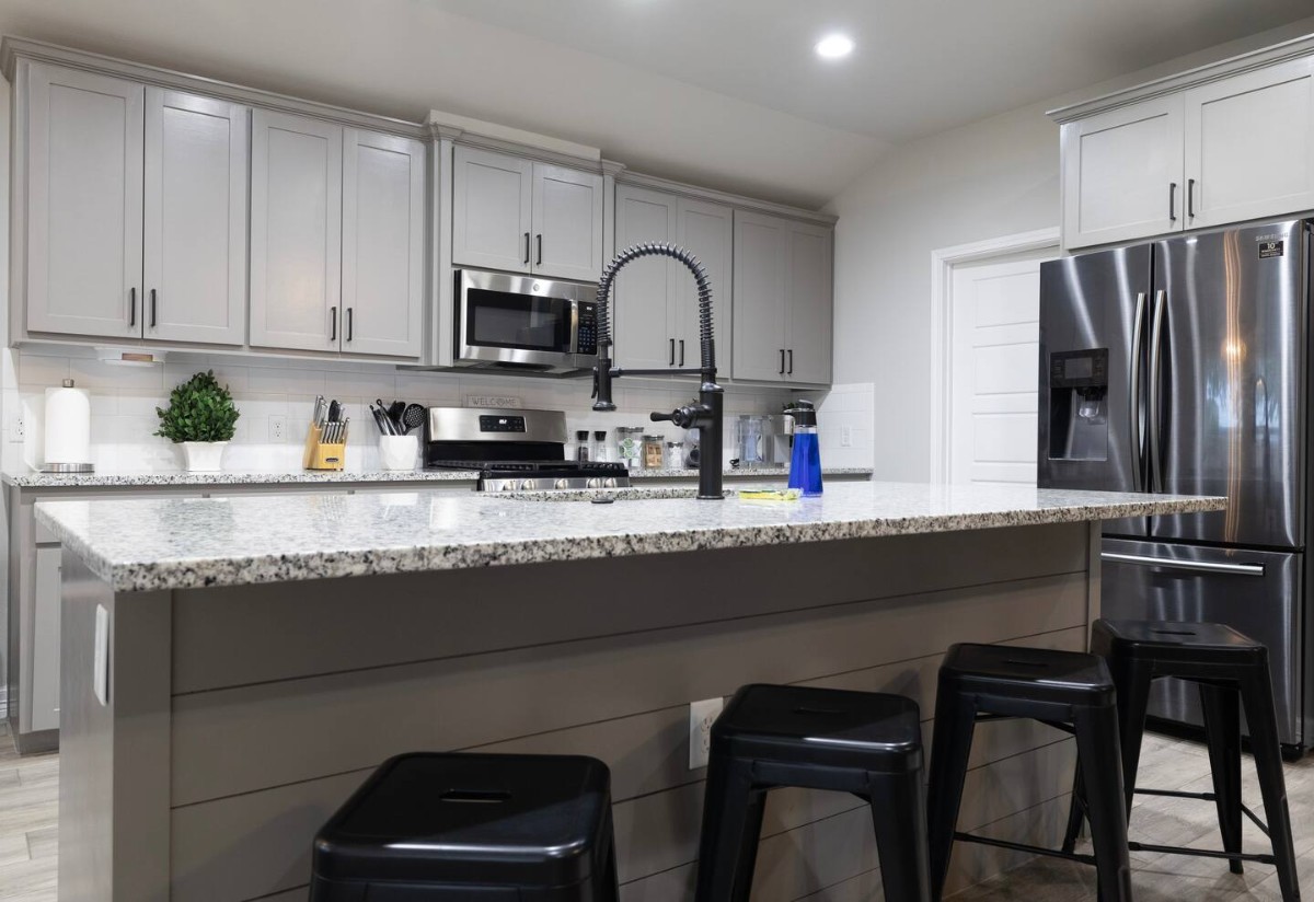 Fully Equipped Kitchen: Stainless steel appliances, granite countertops, and a breakfast bar.