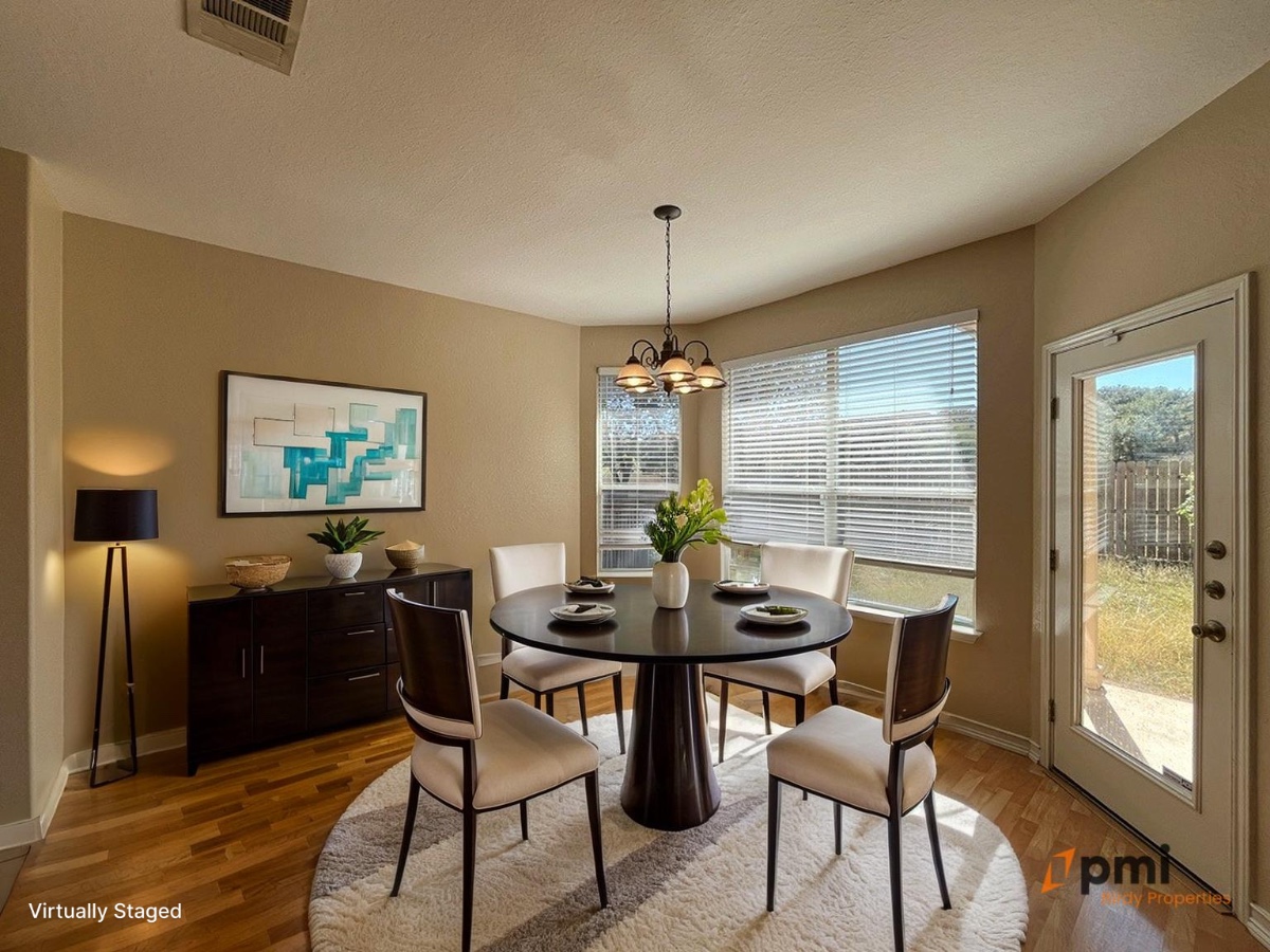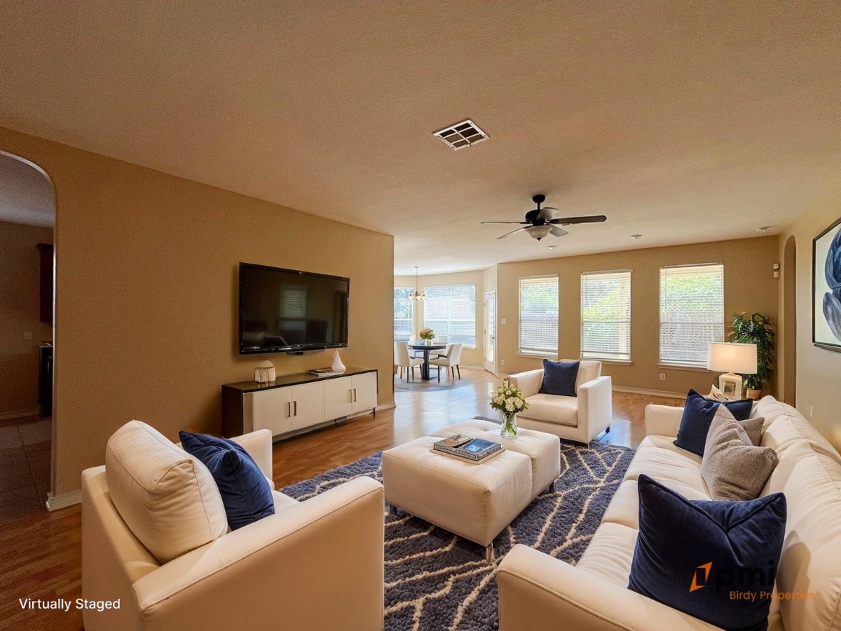 The primary suite is a peaceful retreat featuring a double vanity, walk-in shower, relaxing garden tub and generous walk-in closet. Additional highlights include washer and dryer hookups, a water softener, programmable thermostat and an alarm system for added peace of mind.