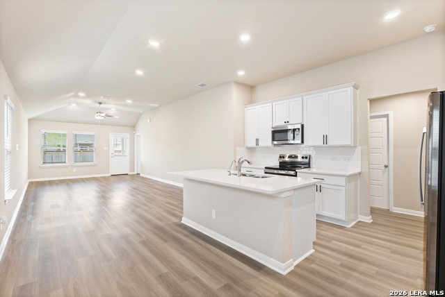 Beautifully maintained single-story home in the desirable Park Place subdivision! This 3-bedroom, 2-bath home with a 2-car garage offers a functional and inviting layout. Step inside to find the laundry room conveniently located near the entry, complete with washer and dryer and additional storage space. Continue into the open-concept living, dining, and kitchen area-perfect for entertaining-featuring stainless steel appliances, smooth cooktop, refrigerator included, ample cabinet space, a large island, and breakfast bar. The split floor plan provides added privacy, with the spacious primary suite located at the rear of the home. The primary bedroom features four large windows overlooking the backyard, a walk-in closet, and an en-suite bath with double vanity and walk-in shower. Bedrooms 2 and 3 are located toward the front of the home off the kitchen, offering generous space, ceiling fans, and a shared hall bathroom. Enjoy the fully fenced backyard with a covered patio and sprinkler system-ideal for relaxing or outdoor gatherings. This home is truly a must-see! Easy access to W. Klein Rd, shopping, dining and all that New Braunfels has to offer. Animal policy: 1-small animal with approval.