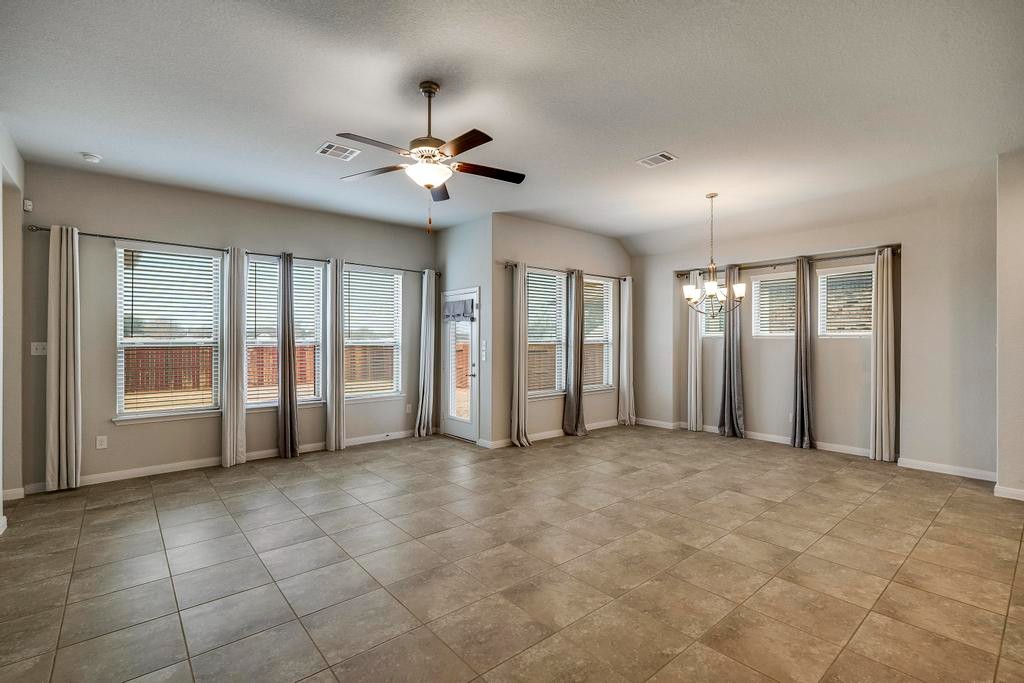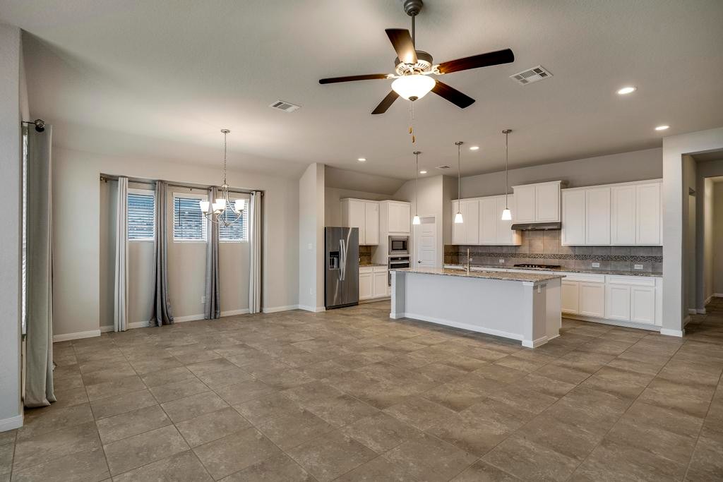 Impeccably maintained Coventry all brick home featuring an energy-efficient EcoSmart design with owned solar panels, monthly utility credits, and solar battery backup! The thoughtfully designed interior offers a tiled entry with French doors to a flex living space and a stunning chef's kitchen with oversized island, gas cooking, built-in oven and microwave, Whirlpool Gold stainless appliances, upgraded backsplash, walk-in pantry, and designer lighting to include under cabinet and pendant. The private primary suite showcases a sitting window and spa bath with garden tub and walk-in shower with bench. Outdoor living is enhanced by a covered patio overlooking a backyard with greenbelt views and stained privacy fence with custom lighting. Additional highlights include irrigation, gutters, security cameras with alarm system, and a quiet community with park access and top-rated Schertz-Cibolo ISD schools. Stainless refrigerator and dining table with chairs convey.