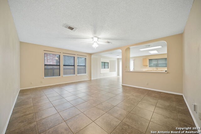 Settle into this spacious one-story home in Regency Meadow, ready for immediate move-in. Designed with an open floor plan and ceramic tile throughout, the home offers easy living and low maintenance. The living room welcomes you with arched entryways, abundant natural light, and a ceiling fan for added comfort. The eat-in kitchen is ideal for gathering, featuring a center island, ample cabinet and counter space, and a large walk-in pantry combined with the laundry room for convenience. The oversized primary bedroom provides a relaxing retreat with a generous walk-in closet and ceiling fan, while the ensuite bath includes a double vanity and tub/shower combo. Step outside to a private backyard with a patio slab and privacy fence-perfect for weekend barbecues or quiet evenings. Conveniently located near major highways, USAA, UTSA, Fiesta Texas, The Rim, La Cantera, and a variety of dining and entertainment options, this home offers both comfort and accessibility.