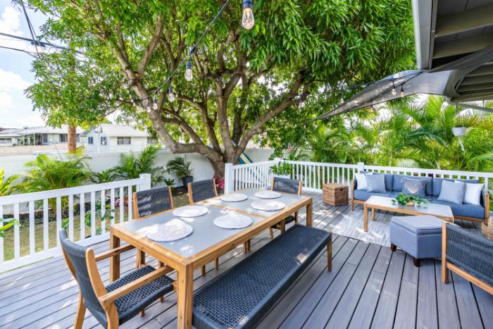 The property has a 320 sq ft deck overlooking a mature mango tree in a vinyl fenced-in yard. The property’s perimeter is surrounded by large areca palms and red ti-leaves, which also includes a fruit-producing Papaya tree that adds to the tropical Hawaii feel!