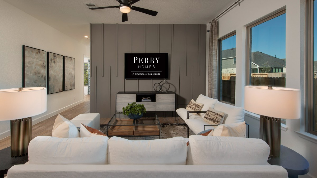 Former Model Home. Entry with 11-foot rotunda ceiling leads to open kitchen, dining area and family room. Kitchen features corner walk-in pantry and generous island with built-in seating space. Primary suite includes double-door entry to primary bath with dual vanities, separate glass-enclosed shower and large walk-in closet. Home office with French doors set at back entrance. Large windows, extra closets and bonus mud room add to this spacious three-bedroom home. Model home upgrades include accent paint, drapes, alarm system, sprinkler system, and additional landscaping. Covered backyard patio. Two-car garage.