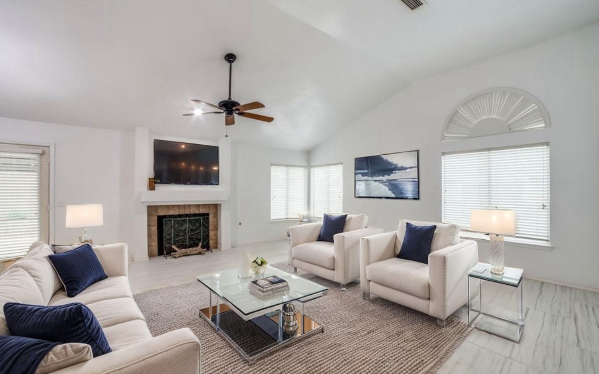 Enjoy a modern kitchen with updated appliances, a spacious primary suite with private bath, ceiling fans in every room, and a fenced backyard with a covered patio perfect for relaxing or entertaining. Two-car garage and extended driveway.