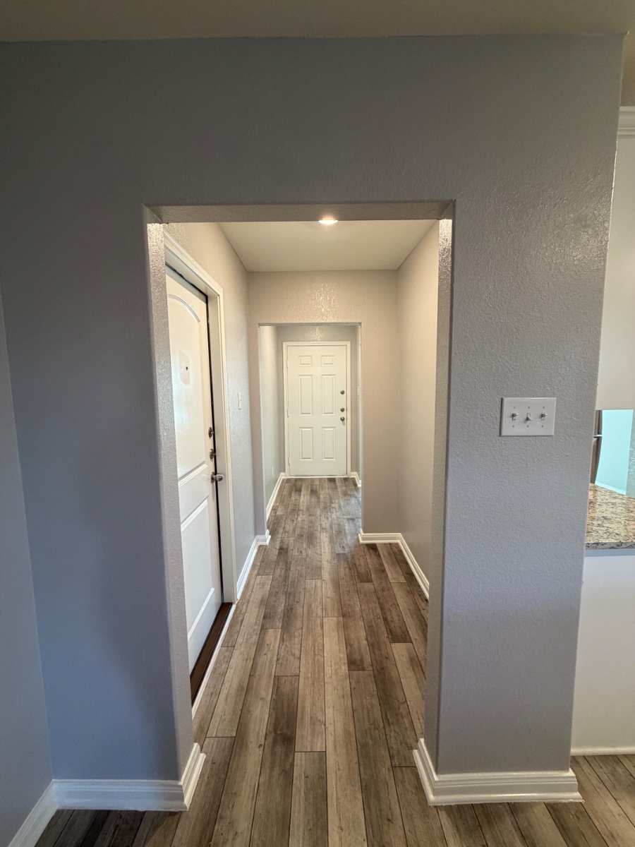 House with great features and amenities with a cheerful blue exterior and a fenced yard. Recently painted in the interior. Open floor plan with wood like vinyl flooring, and neutral color theme throughout the house to give a modern feel. Granite countertops and modern appliances in the kitchen with a storage pantry for additional space. Each bedroom as their own closets, and additional closet in the hallway for more storage. Big walk-in closet in ensuite in Master Bedroom with a spacious vanity.