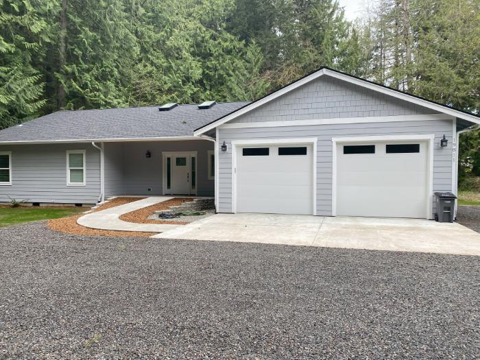 2023 built house in Poulsbo close to schools and shopping and close proximity to military facilities. The 3 bed / 2.5 bath house is 1772 sq ft with a 724 sq ft garage that has two full spaces and additional space for storage, small vehicle or shop work area. Plenty of additional parking outside garage that can accommodate an RV or boat. House is on 1.25 private acres with septic and shared well water with three other houses. Entry to front door and master shower are walk in with no steps. Concrete patios in front and back. Vaulted great room with propane fireplace and island seating in kitchen area. All kitchen and laundry appliances included. Bonus rooms include a small office/den and a large coat closet that has plenty of storage room. Two linen closets and additional toilet in laundry room that can be accessed from the garage and back of the house. Propane tankless water heater and electric heat pump and mini-splits with variable heating/air conditioning.