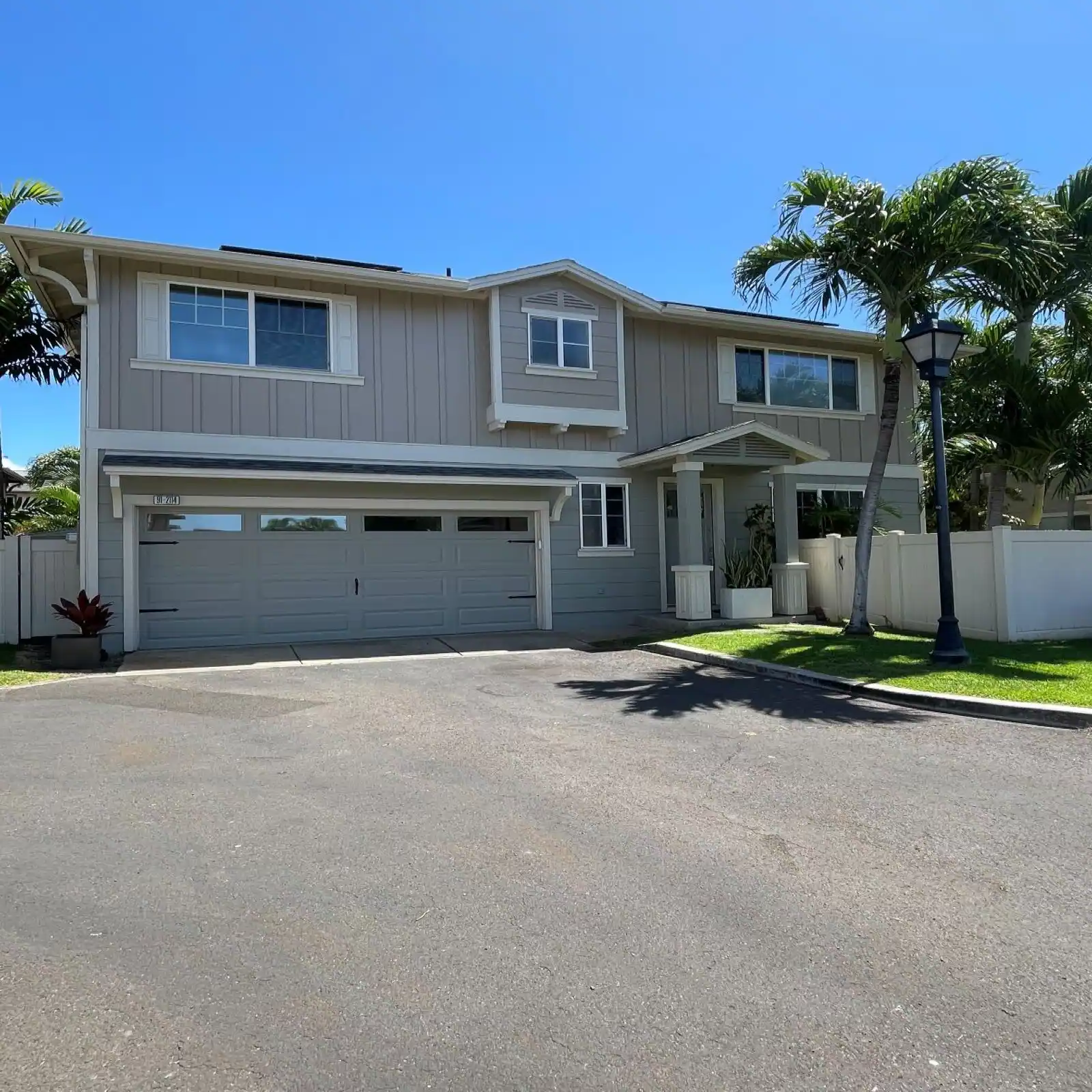 SAVE HUNDREDS $$ on utilities - 27 Owned PV Panels and Water INCLUDED. Corner lot with sizeable back yard covered with lush palm trees, local florals and overhead string lights for a calming ambience. Brand new flooring throughout the home with all NEW modern water and light fixtures. Newly replaced HVAC for ease of cooling (remember, 27 Solar Panels!) and ceiling fans in every room to include the master walk-in closet. Decorative flooring in the garage and Lanai’s (patios) for hosting that bring ease to cleaning up. Sturdy overhead built in garage shelving to include a large shed in the backyard offering an abundance of much needed storage. Fresh, timeless paint both inside and out to accommodate any decor. Community pool within walking distance. Close proximity (5-10mins) to the newly opened wave pool, grocery stores, restaurants, beaches, and Ka’Makana Mall. Small Pet upon approval/ no smoking, sorry. Available June 1st, which is an extremely busy moving season, so inquire soon. Text, Jay: 808.800.7687 or email perezjayj@gmail.com