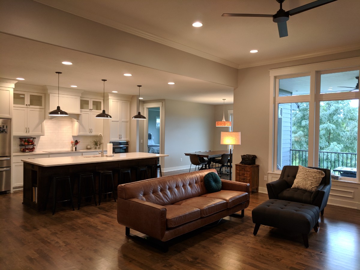 Great Room & Dining: An open-concept living area bathed in natural light, featuring rich hardwood floors that flow throughout the entire home.
