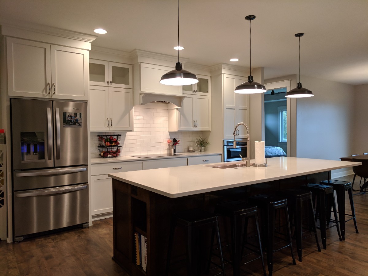 Gourmet Kitchen: A chef's dream featuring bright white cabinetry, a massive dark-wood island with seating, premium stainless steel appliances, induction stovetop, and sleek quartz countertops.