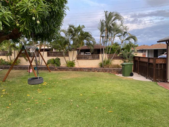 Available for two year lease. Relax and enjoy the privacy of this spacious yard. Friendly neighbors! All the yard you will need. The perfect house for all occasions, children playing, entertaining, BBQing or just relaxing. This house has all major appliances, washer, dryer, refrigerator, dishwasher and microwave. There are three full bathrooms, one with shower only and the other two with shower and bathtub. Rent includes monthly pest control and once a month yard maintenance! Huge, fenced yard and lanai, great for pets, children, and private gathering. Several fruits tree. Large master bedroom, with walk in closet, master bathroom with double sinks, separate shower and jacuzzi bath. Smaller master bedroom, 9X12 with its own bathroom. Third bedroom, 9x12. House has photovoltaic system, so electric bill is very reasonable. Also, has solar 120-gallon hot water system, so plenty of hot water and two split and two window ACs. All utilities renter’s responsibility, (water/sewer, electric, cable). Lots of storage and large covered work area. Great neighbors. Pets are subject to approval with additional monthly fee. Walking distance to Dennys, Walmart, Foodland and many restaurants. Short drive to the beach, KO-Olina, Ka Makana Ali, Kapolei Costco, Waikele, Aulani Disney Resort, civilian hospital w/ER and Kunia urgent care clinic. Easy access to H-1 (5 -7 minutes). Application, background check, credit score, first months rent and one month security deposit, two-year rental agreement, renters insurance required. The location is close to most military installations. If looking to buy a house on Oahu, this is a perfect opportunity to rent to learn the layout and get your bearings of Oahu prior to making that million-dollar purchase. So, it may be to your benefit to rent first. Unlike Ewa, the house is located about 5 minutes after exiting H1 freeway, something you will learn to appreciate. Looking forward to helping those who are serving. If you have any questions about the property, costs or lease, please feel free to text me at (808) 327-8587. May be available earlier.