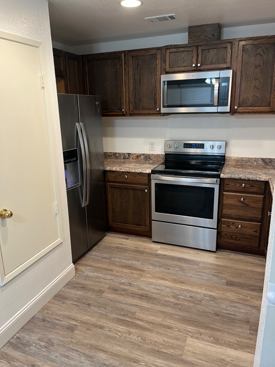Exceptionally clean with brand new carpet. Beautiful vinyl plank waterproof flooring in kitchen and bathrooms. All stainless steel appliances, including a space saving built in microwave. Smart thermostat for easy temperature control. Relaxing recessed lighting and ceiling fan in living room. Newer central heating and air conditioning system for better efficiency. Garage has washer and dryer hook ups. Spacious covered back patio. Large, fenced backyard, great for gardening or other activities. Expansive additional concrete pad in front provides for extra off-street parking for your cars, boat, or RV. This is a smoke free household. Non- aggressive breed pets may be considered with additional deposit upon approval.
