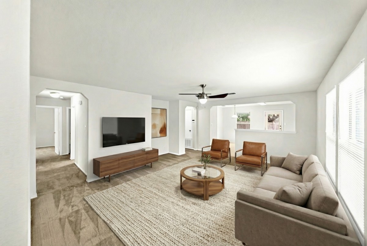 Ceiling fans throughout add both comfort and efficiency, while the open floor plan creates a natural flow between rooms, making the home feel larger and brighter.