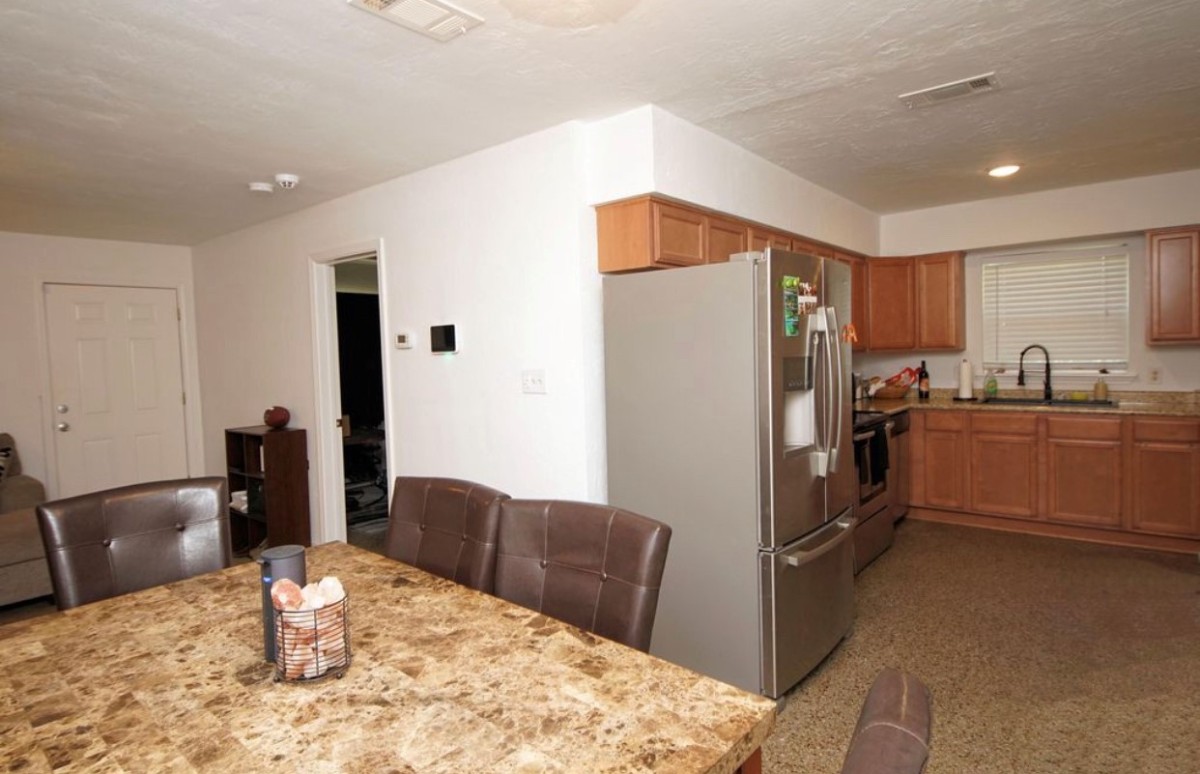 The house has a nice kitchen with lots of cabinets and a stainless steel fridge, stove, microwave, dishwasher PLUS washer and dryer. There are ceiling fans in each bedroom, in addition to central A/C in the house. Carport for parking, with ample space in the driveway for several more cars.