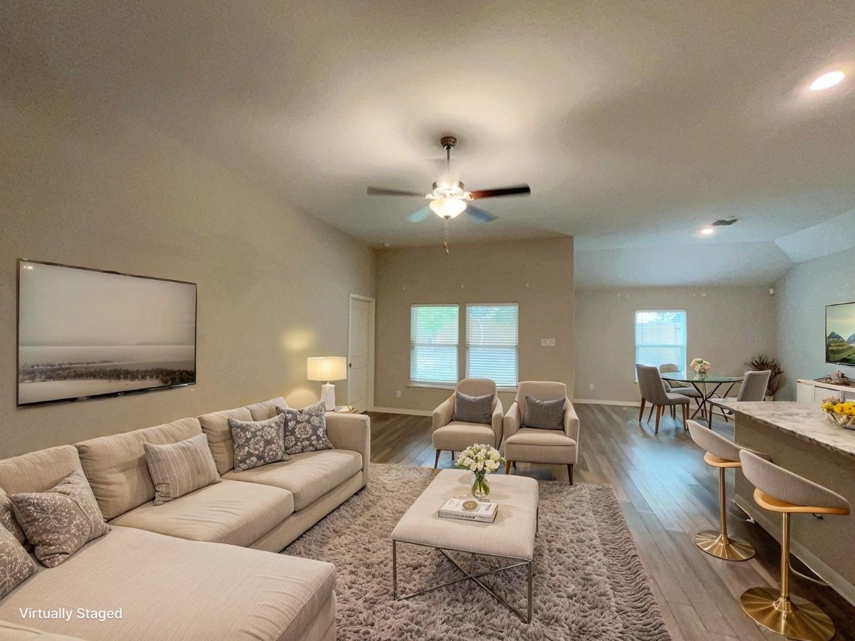 Welcome to this beautifully designed 4-bedroom, 2-bath home that combines comfort, style, and everyday functionality. Featuring a spacious open floor plan, this residence offers both a welcoming living room and a separate dining area, perfect for relaxing or entertaining. High ceilings enhance the sense of space, while a mix of carpet and vinyl flooring adds warmth and durability throughout.