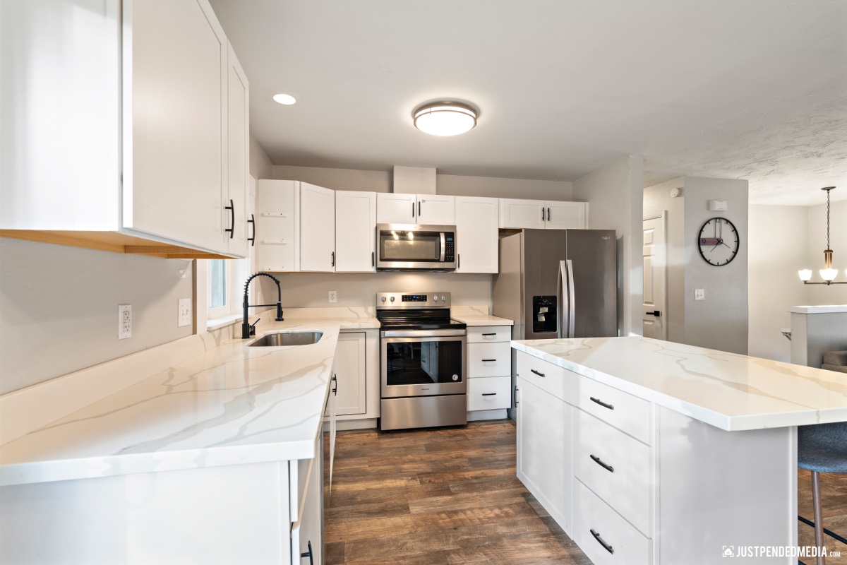 The main level features a bright open-concept layout with large windows, modern flooring, and excellent natural light. The fully updated kitchen includes white shaker cabinets, quartz countertops, stainless steel appliances, a large island with storage, and plenty of workspace perfect for cooking and entertaining. The dining area opens to a private deck overlooking the fully fenced backyard.
