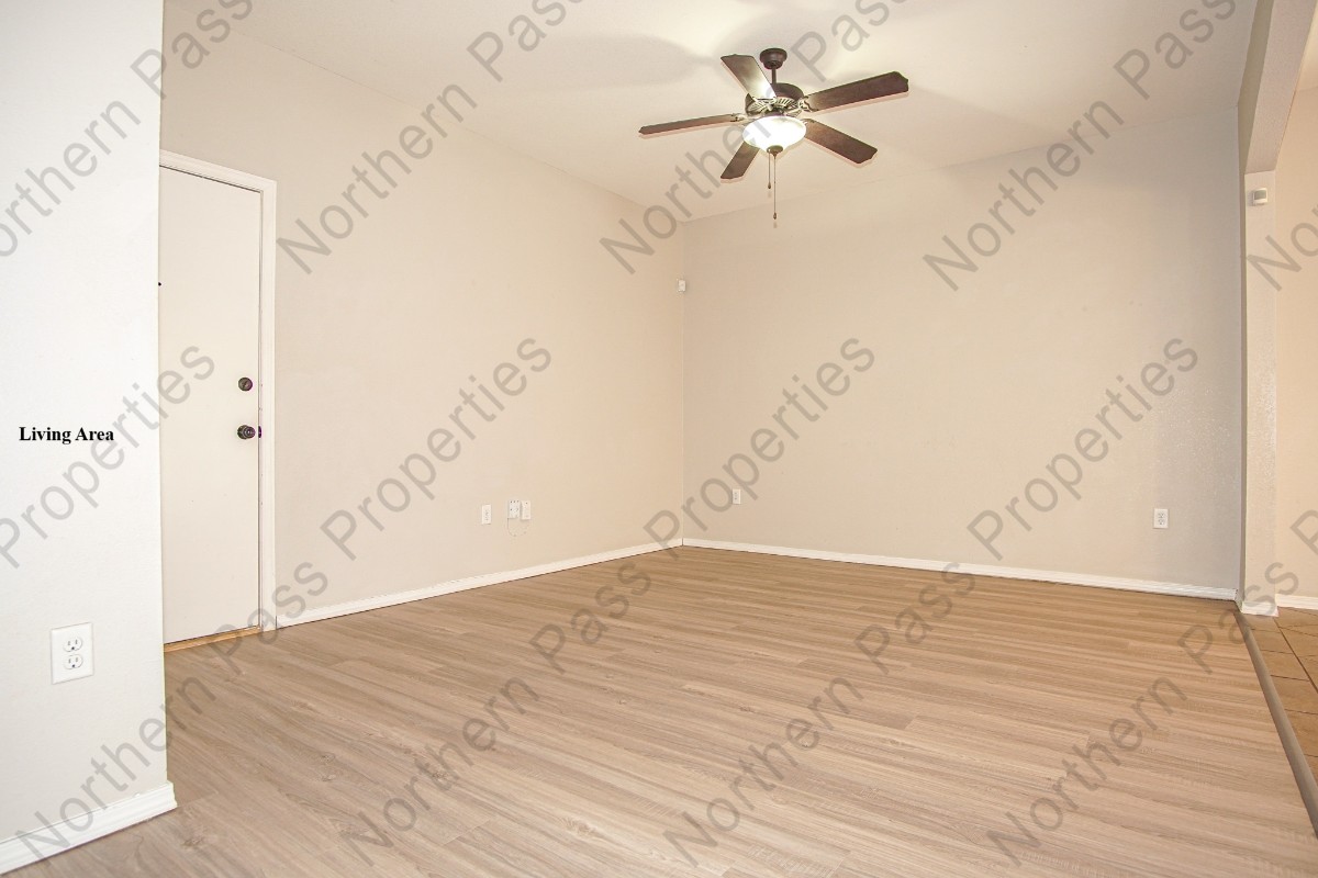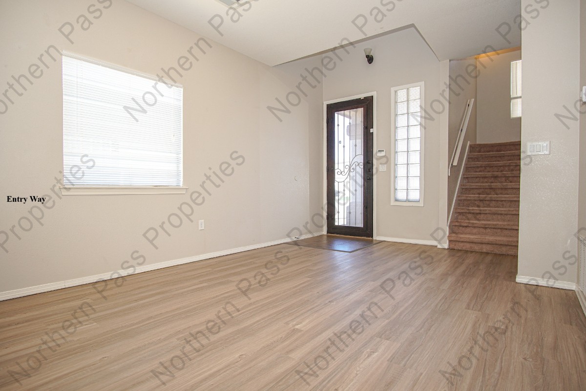 This gorgeous 4-bedroom 2.5 bathroom home is located off of Tierra Este near Zaragoza with access to 375 and plenty of shopping and dining options. Walk into the formal living room before continuing down the hall to the open floor plan of the den, dining room, and kitchen. Granite countertops and stainless steel refrigerator, stove, microwave, and dishwasher are featured in the kitchen, with the half bathroom located next to the stairs. Upstairs you'll find three guest bedrooms with a full bathroom and the primary suite features a walk-in closet and double vanity and garden tub in the primary bathroom. Enjoy a low-maintenance front yard, large backyard, and REFRIGERATED AC in this beautiful home.