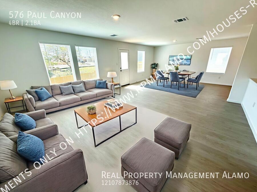 Welcome to 576 Paul Canyon, a newly built two-story home in one of San Antonio’s growing subdivisions. This spacious property features four bedrooms and two and a half bathrooms, with all bedrooms located upstairs for added privacy. A versatile upstairs loft offers the perfect space for a second living area, home office, or playroom. Inside, you’ll enjoy brand-new flooring and fresh paint throughout, with cozy carpet in all bedrooms and upstairs spaces. The modern open kitchen is designed for everyday living and entertaining, complete with stainless steel appliances—refrigerator, stove/oven, built-in microwave, dishwasher—plus a washer and dryer included for added convenience. Central air and heat ensure year-round comfort, while the primary suite boasts a walk-in closet for ample storage. Step outside to a large backyard, perfect for gatherings, outdoor activities, or relaxation. A two-car garage adds secure parking and extra storage space. With its thoughtful layout and modern finishes, this home is move-in ready and waiting for you in a vibrant San Antonio neighborhood. For more information, e-mail us at Lease@rpmalamo.com. Thank you!