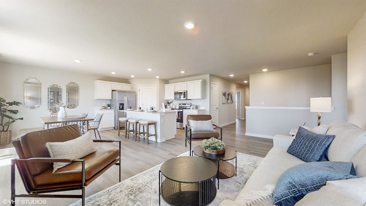 Step inside to a bright foyer leading past two spacious bedrooms and a full bath—perfect for guests, family, or a home office. The kitchen features white cabinetry, stainless steel appliances, a large walk in pantry, and a large island ideal for entertaining or casual meals. The great room, filled with natural light, offers a welcoming atmosphere for gatherings or cozy nights by the electric fireplace.