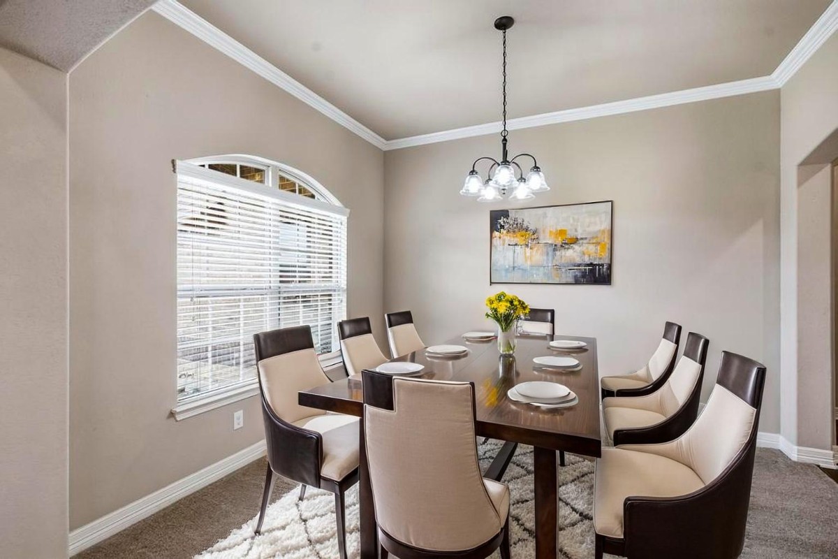 Exquisite custom all-brick one-story estate set on over half an acre, backing to open green space. The grand entry welcomes with soaring ceilings, dual chandeliers, and rich real wood flooring extending into an oversized family room anchored by a corner gas-log fireplace. Designed for both elegant entertaining and comfortable living, the home offers formal dining, a separate living area, powder bath, and a dedicated media room complete with projector, screen, and surround sound. The gourmet island kitchen features stainless steel appliances, a 5-burner gas cooktop with vent hood, built-in oven and microwave, custom cabinetry, a butler's pantry with coffee bar, and a large walk-in pantry. The luxurious primary suite includes dual walk-in closets and a spa-inspired bath with split vanities, a 3-way mirror, garden tub, and walk-in shower with seating. A private guest suite with full bath and two secondary bedrooms connected by a Jack-and-Jill bath provide ideal accommodations. Outdoor living is exceptional with an epoxy-finished covered patio featuring ceiling fan, TV mount, and sunshade, plus a separate pavilion with built-in outdoor kitchen overlooking the expansive green space. Additional features include a storage shed, fire pit, water softener, alarm system, custom 2-inch blinds, ceiling fans throughout, and an oversized side-entry 3-car garage. Located in a quiet gated community just minutes from Hwy 211, shopping, and dining.