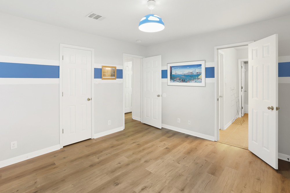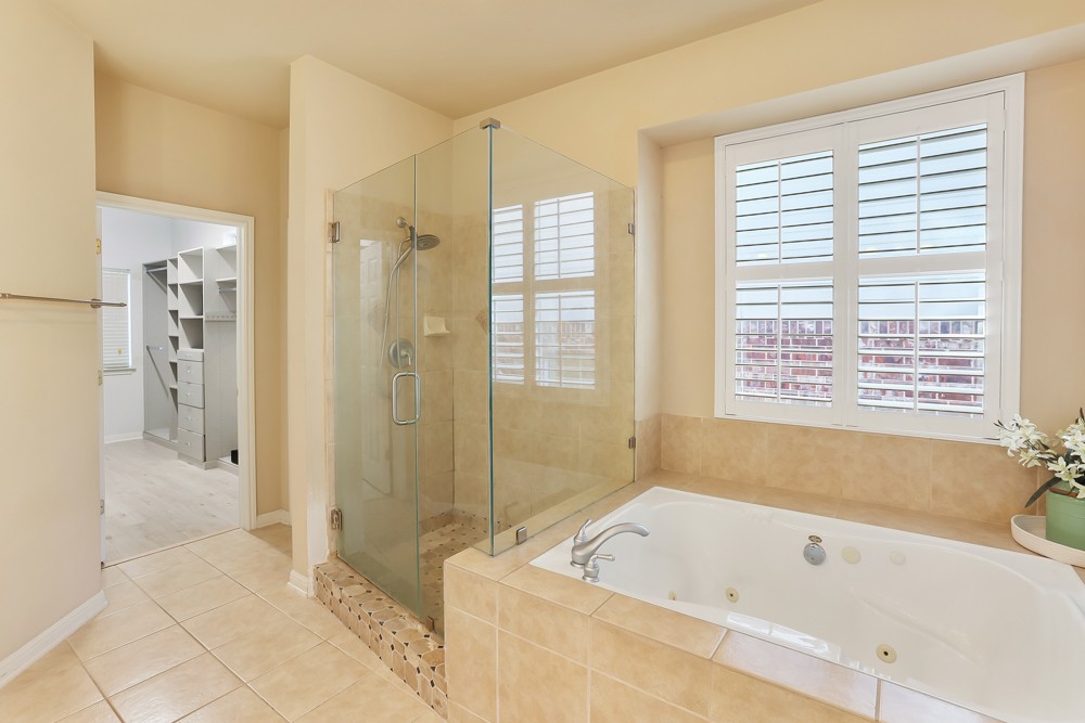 The primary suite is tucked away on the first floor and features crown molding, high ceilings, plantation blinds, and a ceiling fan for added comfort. The ensuite bath offers dual vanities, a garden tub, separate shower, and a generous walk-in closet. Upstairs, a spacious family room is perfect for game or movie nights, complemented by well-sized secondary bedrooms ideal for family or guests.