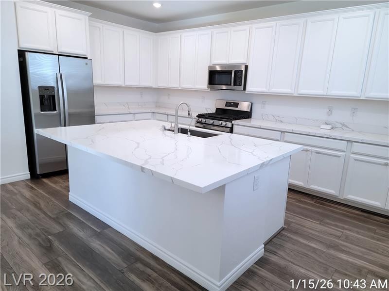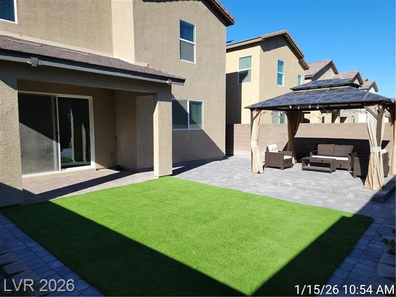 Located down the street from Nellis AFB....This spacious and thoughtfully designed home offers 4 bedroom, including a convenient downstairs bedroom that’s perfect for guests or a home office. The kitchen features crisp white cabinets, quartz countertops & stainless steel appliances, all complemented by luxury vinyl plank flooring throughout the main level for a modern, durable finish. The open layout flows easily into the living and dining areas, making the home feel both functional & welcoming. Upstairs primary bedroom with 2 walk-in closets, dbl sinks and separate tub and shower. Step outside to a low-maintenance backyard designed for easy living, complete with pavers, Covered patio, Gazebo and synthetic grass, ideal for enjoying outdoor time without the upkeep. The home also includes solar, offering energy efficiency 7 potential utility savings. With a blend of style, comfort & practicality, this home is well-suited for today’s lifestyle. Base rent $2163 + $37 RBP